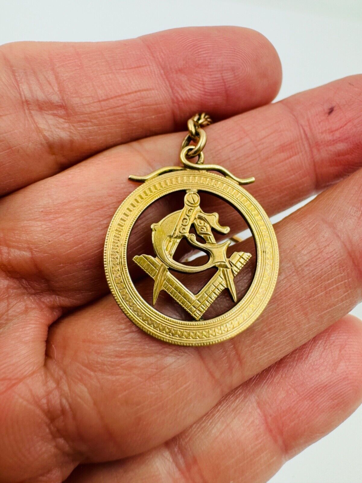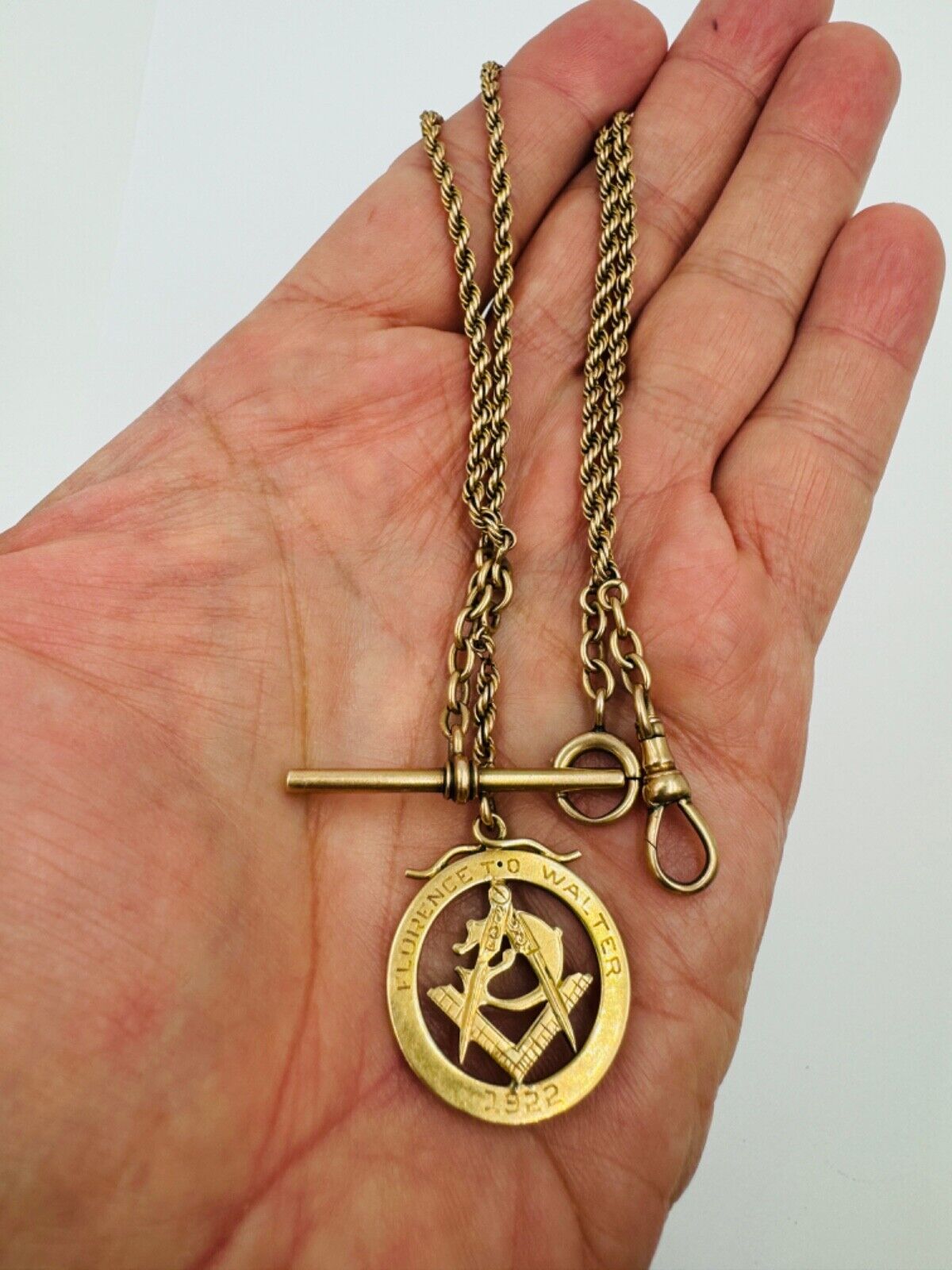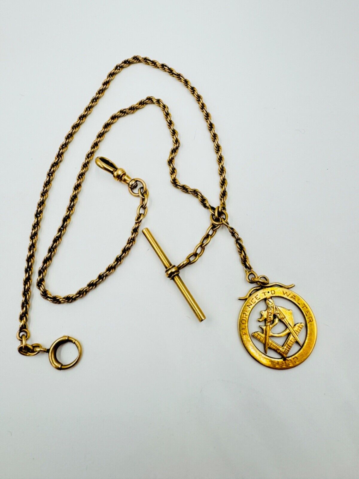 Antique 10k yellow gold pocket watch chain Necklace with Masonic fob. It in as found condition with no issues to note, we don't polish any of our antique pieces we leave this up to the discretion of the buyer.