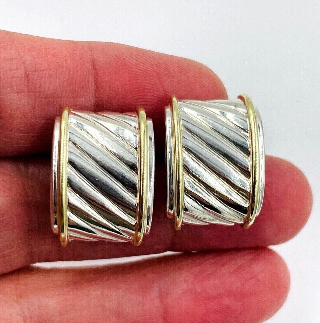 Excellent Authentic David Yurman Thoroughbred Sterling Silver and 14k yellow gold post earrings. They have been professionally polished and look great, the omega clips work great with no issues. They measure about 21.2mm by 15mm weighing 12.8 grams. They are fully hallmarked and authenticated. We are jewelers all of our items are professionally inspected and tested, we guarantee all of our items to be as described. We have many other hard to find items listed so please take a look, you never know what you might find. Thank you and happy shopping.
