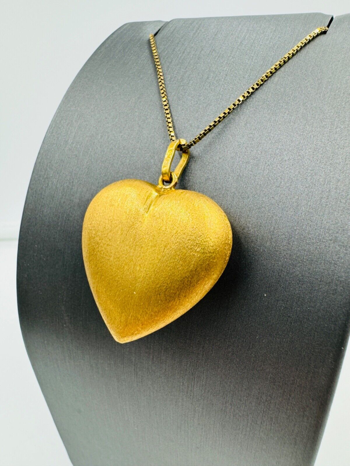 Vintage 18k yellow gold Puffed Heart with satin finish pendant necklace. This handmade lovely, bold, sophisticated look that will accent any out fit beautifully. This pendant has lovely finely textured finish in beautiful condition considering it's age. The chain is 14k yellow gold 19" long box link, which we paired with this amazing pendant. The pendant is about 1 1/8" x 1 1/8" without the bale by 8.9mm thick weighing 10.2 grams with the chain. The pendant is hallmarked "18K" and the chain is hallmarked "14k" both having been tested. We have not polished it just lightly cleaned and looks amazing as is.