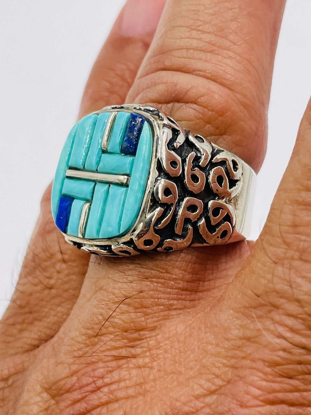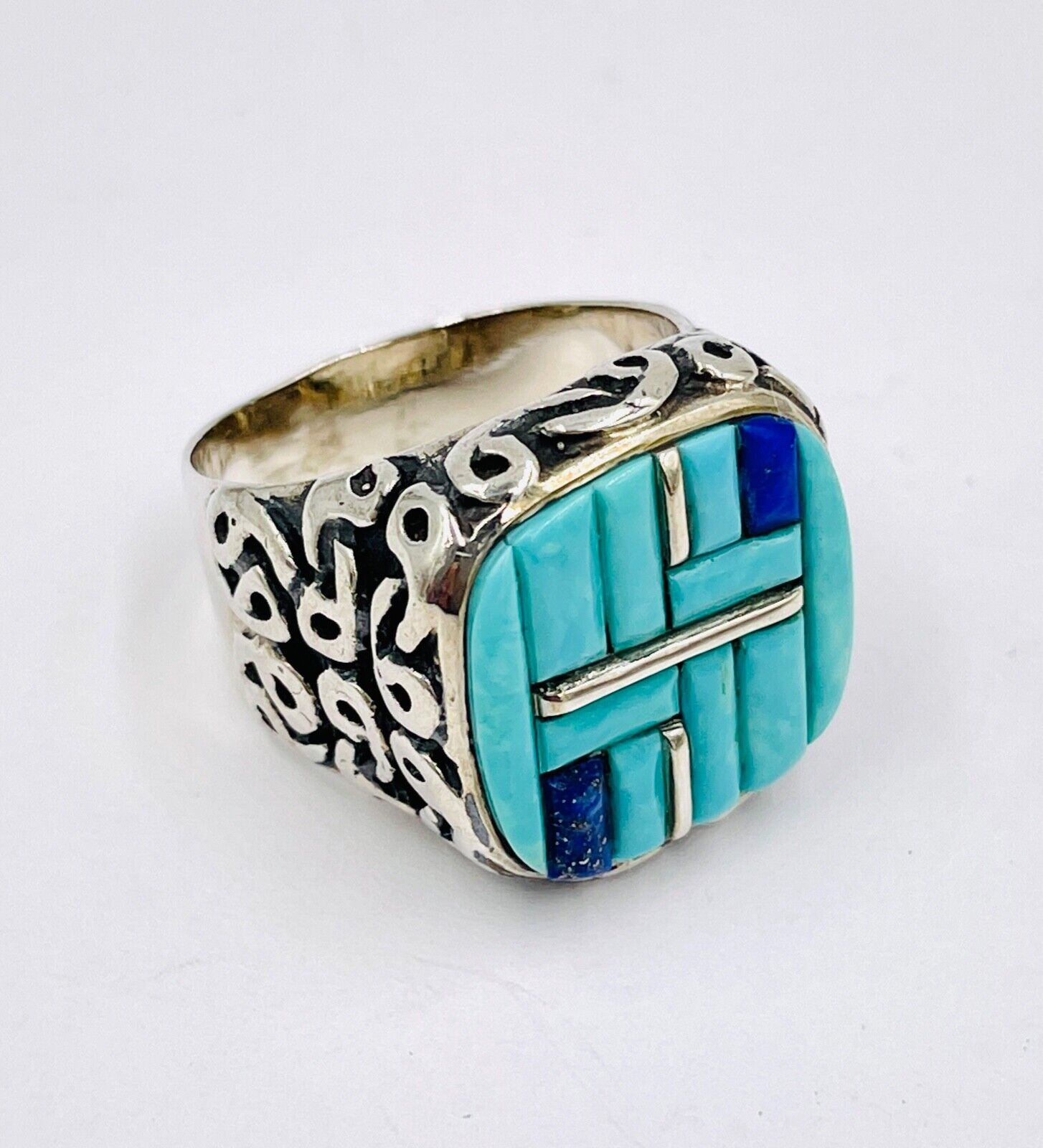 Excellent Estate find, Myra Nastacio Zuni Sterling silver turquoise and lapis inlay ring. This is a chunky big bold ring, with rounded corners and 69 motif pattern. It's in as found condition and ready to wear, just lightly cleaned never polished. Ring size 9.5, sizable upon request. Top of the ring is about 20mm by 20mm, fully hallmarked shown in the pictures. We are jewelers all of our items are professionally inspected and tested, we guarantee all of our items to be as described. We have many other hard to find items listed so please take a look, you never know what you might find. Thank you and happy shopping.