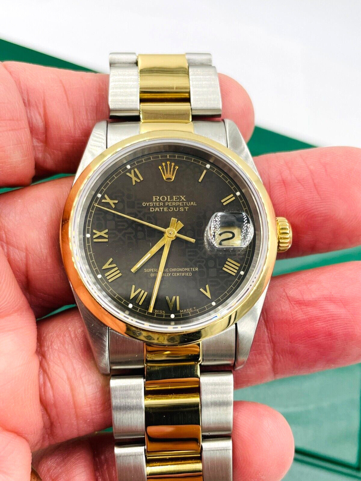 For your consideration Rolex Datejust ref: 16203 18k + Stainless with oyster band, 36mm automatic mens watch, circa 1999. This is a no holes case 36mm mens, quick set and sapphire crystal. Overall in very good condition with minor superficial scratches, hardly worth mentioning. This authentic Rolex has been service running strong with no issues to note. It will fit up to a 7" wrist, the band has some stretch consistent with it's age, but nothing that takes away from the integrity of the watch. It will come with presentation box box.