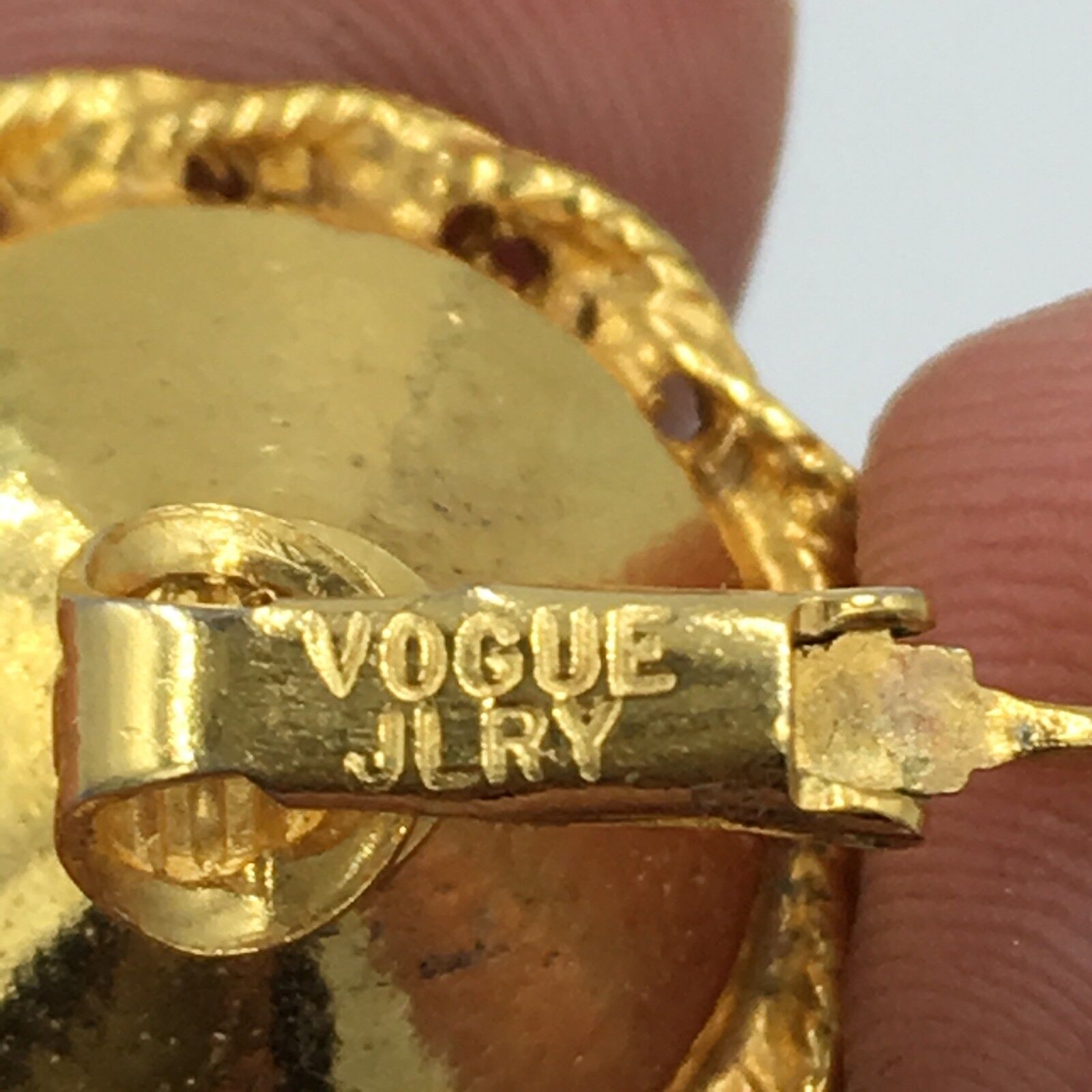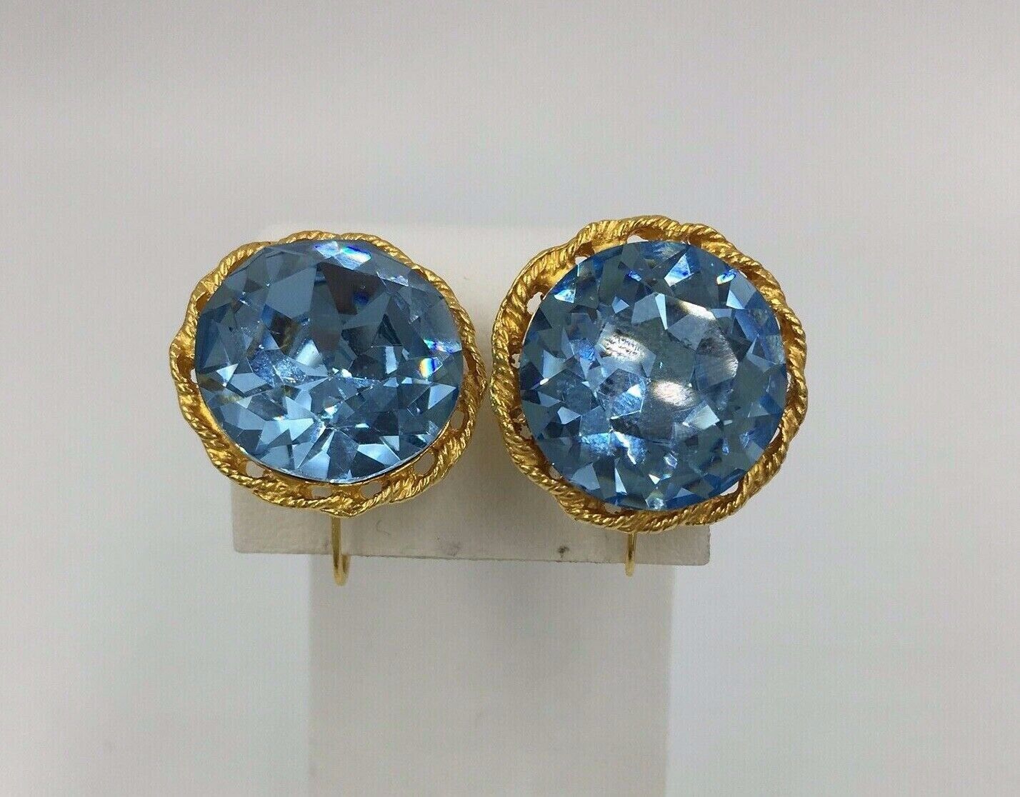 Vintage Vogue Jlry Gold Tone Blue Rhinestone Clip Earrings. They are in stunning condition with NO issues to note. The gold tone is vibrant with no issues, and all the Rhinestone are intact. They measure about 3/4” in diameter. They are hallmarked Vogue JLRY. Please look at the pictures for visual description. I have many other hard to find items listed so please take a look, you never know what you might find. We are a jewelry store all of our items are professionally inspected and tested, we guarantee all of our items to be as described. Thank you and Happy shopping.